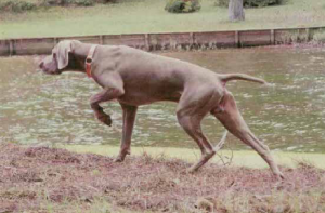 Ebenso selbstverständlich ist auch die Vorstehanlage beim Weimaraner fest verankert. Es muss jedoch darauf hingewiesen werden, dass diese Anlage bei dieser ohnehin nicht extrem frühreifen Rasse in der Jugend oft etwas spät zum Durchbruch kommen kann, zumal die Neigung zum Ausarbeiten von Spuren und Geläufen mit tiefer Nase dem etwas entgegensteht.